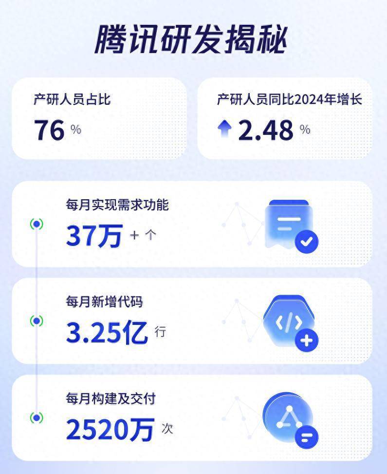 2025年,腾讯产研人员占比达76%,每 4 个腾讯员工中就有 3 个从事研发工作。腾讯月均新增代码3.25亿行,每月完成需求37万个,构建交付2520万次,支撑业务快速迭代。