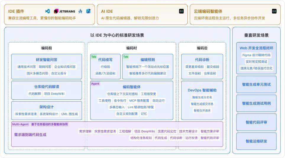 原生体验:革新开发协作模式。AI原生代码编辑器和云端编码智能体带来多任务异步开发、人机深度协作的新一代智能开发体验。