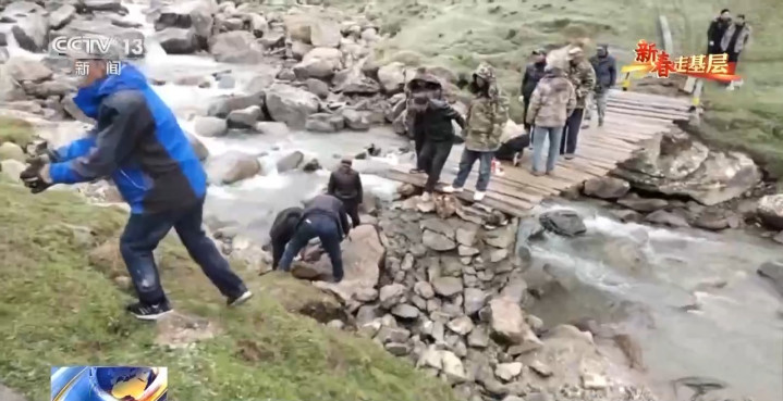 一路危机四伏,终于把三根超长的木料运进来了,三连队员们齐上阵,搭起了一座连心桥,牧民们拍手称快。