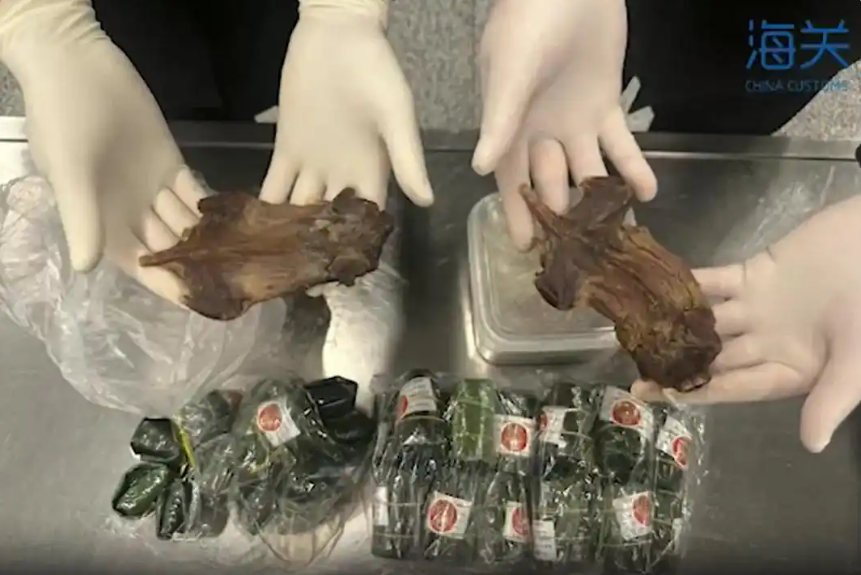 1月27日,湖南长沙黄花机场海关在对入境航班进行监管时,发现某件托运入境的行李机检图像异常。经开箱查验,从目标行李中查获老鼠肉干,酱汤泡蚂蚁卵等动物制品,约4.74公斤。